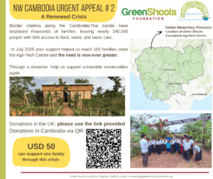 Aggressive fighting along the Cambodia–Thailand border began in early December 2025. It displaced nearly 150,000 families in the province of Oddar Meanchey where Green Shoots works. Forcing people to leave behind homes, farms, and livelihoods- children stopped going to school.